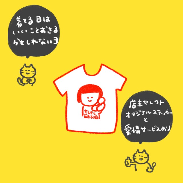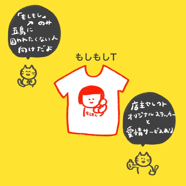 もしもしちゃんのTシャツ! 「もしもし」とだけ文字が書かれてあるよ 五島列島もついたやつはべつにあります!
